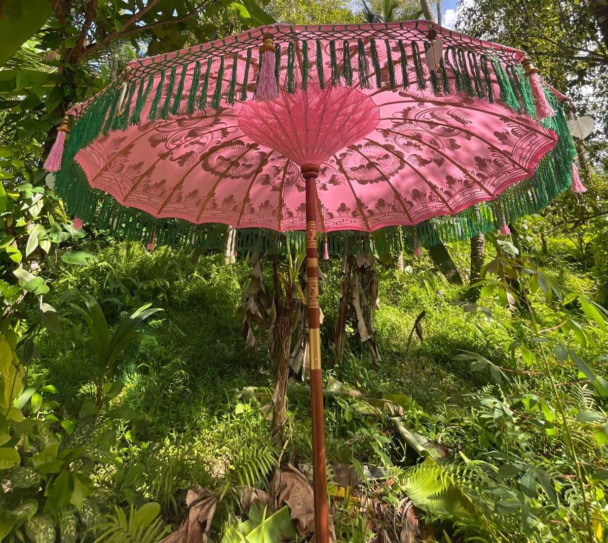 Bu koyu kırmızı şemsiye çok popüler oldu. Bali ve Java’daki yetenekli ustalarımız tarafından el yapımı ve boyalı olarak üretilmektedir. Durian ve bambu ağacından yapılmış olup, polyester/pamuk karışımı kumaşı sayesinde muhteşem bir görünüm ve his sunmaktadır. Ayrıca su geçirmez özelliktedir.